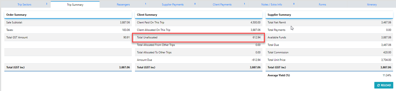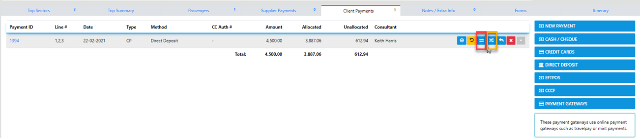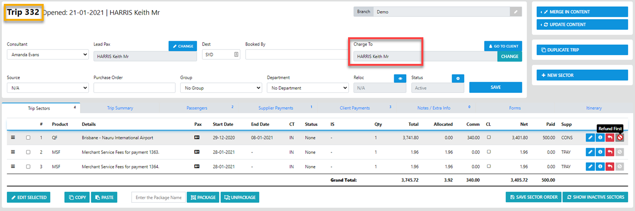 NOW - IF your permissions allow it you can either Transfer funds from one Trip to Another (where the ChageTo is exactly the Same entity) OR Transfer from the Source trip to a completely different Clients trip