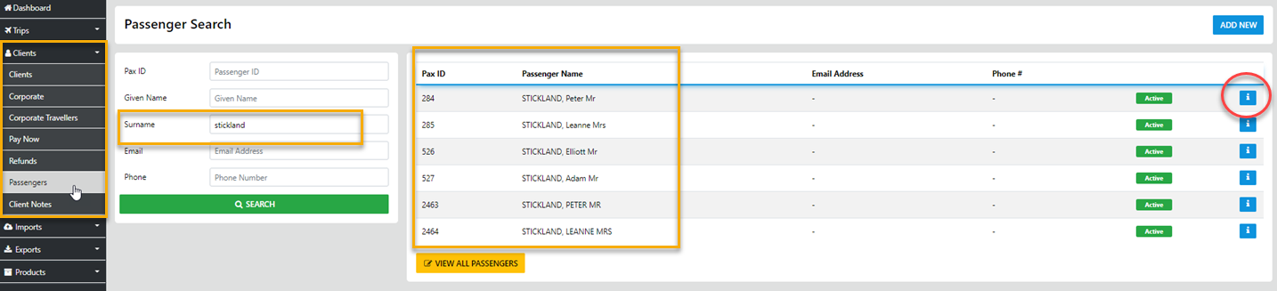 Whilst there is more than one way to achieve this the simplest is to Select Clients (on the sideBar) then Select Passengers