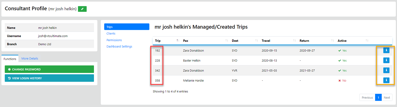 IF your permissions allow it you can drill down to a specific Users profile which will immediately display a list of that users managed trips