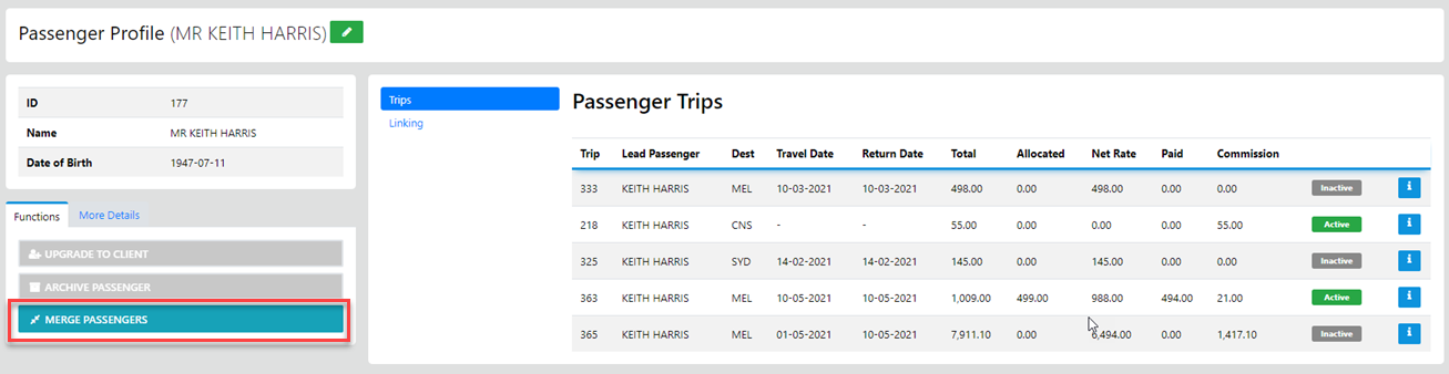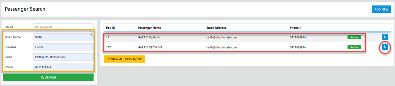 THEN - Select the Info or Details Option to reveal the selected Passenger profile
