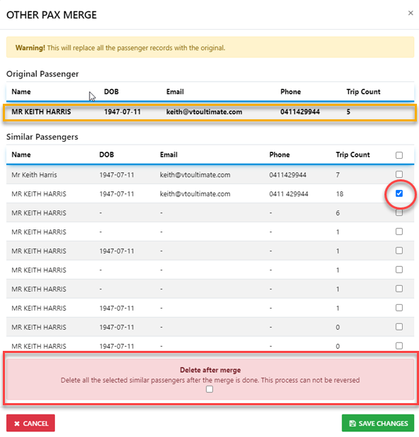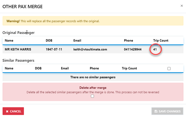 It's important to ALWAYS Merge the Profile with the Least number of trips and details into the Profile with the most