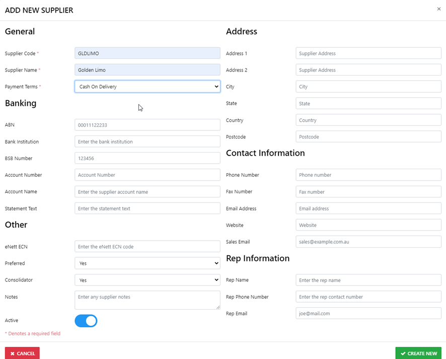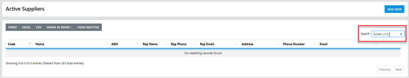 In our example the Supplier Golden Limo is not in our DB so the next step is to ADD the Supplier for future use, we do that by  selecting  ADD NEW   and the following screen will be revealed