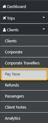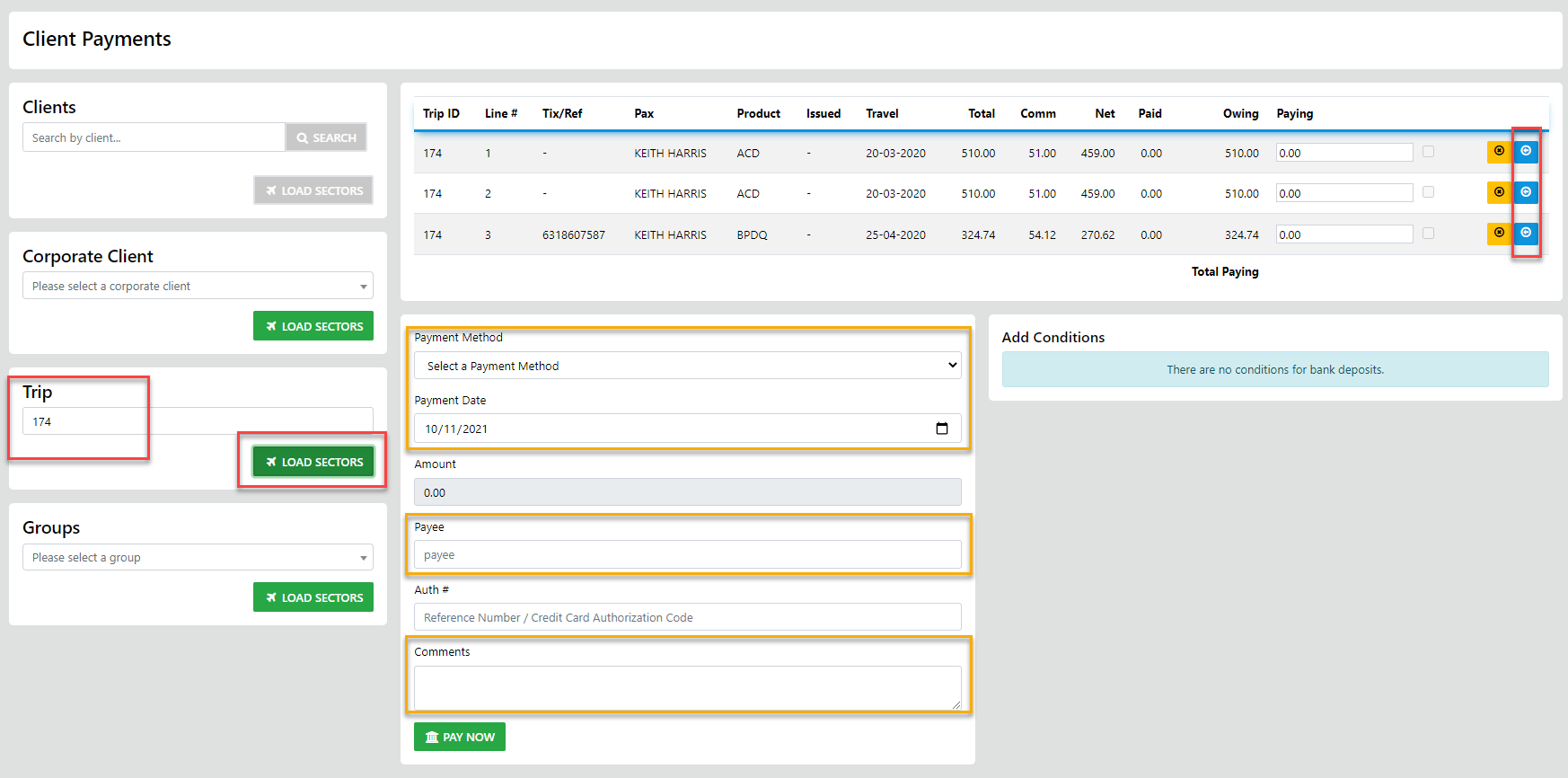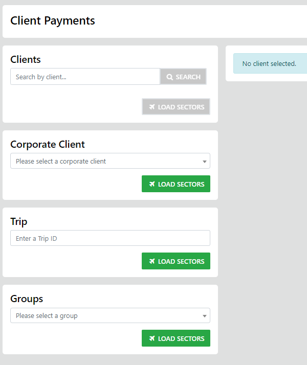 here you can enter either the client lastName - which will display ALL of the Trip Sectors that are awaiting payment for the selected Client - OR - you can select the Corporate Entity - A Group with appropriate results displayed - OR - you can as in our example select Trip and eter the Trip ID/# - this will display all of the unallocated sectors for that trip.