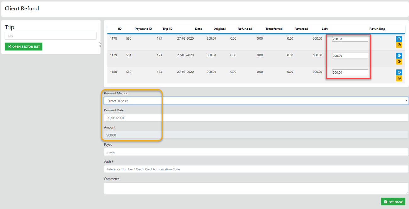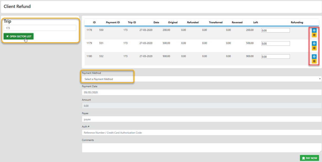Just enter the trip number you want to process a refund on and the result displays the funds from all sectors as being un-allocated EXCEPT for CCCF transactions
