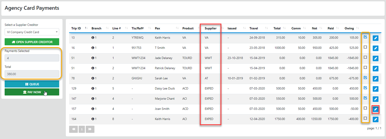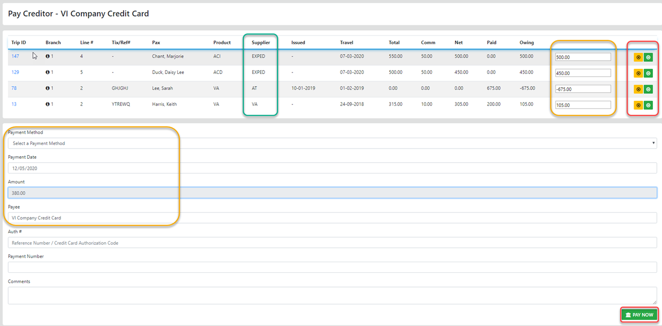 The Pay Now option accessed from the sideBar under Agency Cards allows you to process full - partial payments OR a Mix of for the trip sector in one process