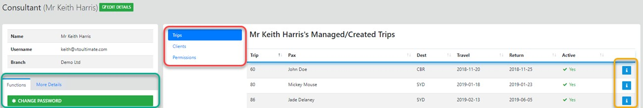 Displays ALL trips managed by the selected Consultant