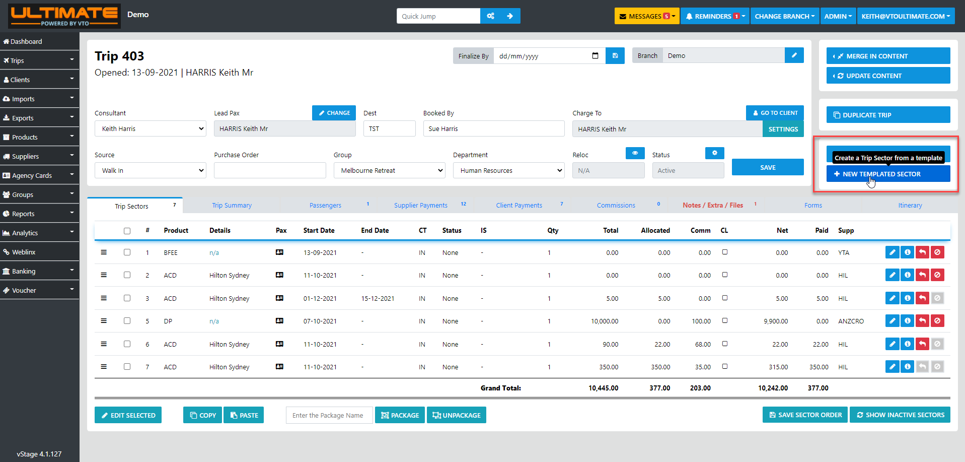 to add a stored template to a trip simple select the New Templated Sector Optin in the trip