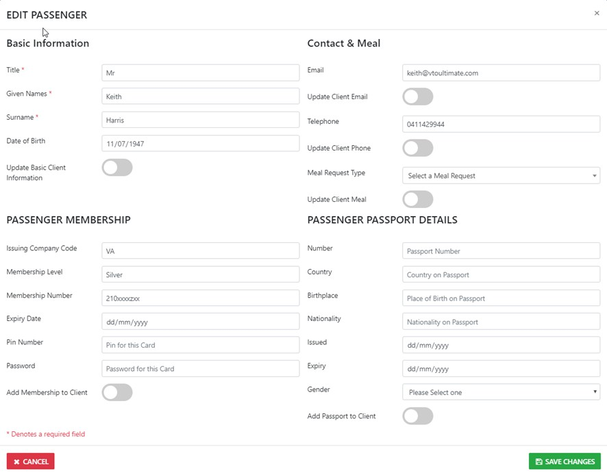 to Update the profile details for the trip Passenger select the Info Option and the following screen will display allowing for editing if and when required, to edit just select Edit Details