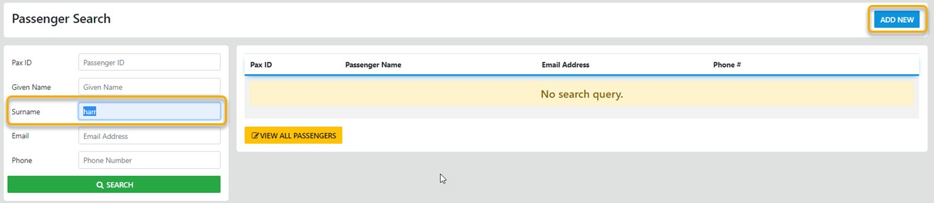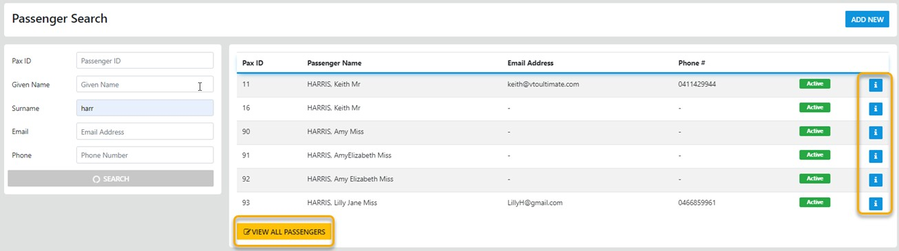 Select Passengers and the filter options for all Trip Passengers will display, to create a New Passenger Profile Select ADD NEW