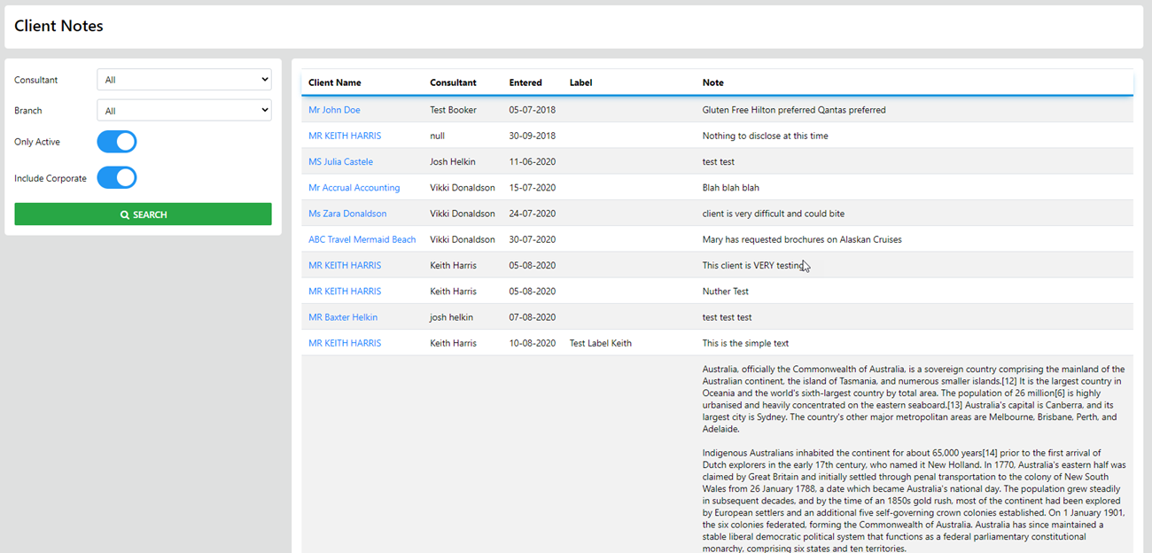 You can quickly drill down to a client profile by selecting the hyperlinked Client Name and ADD or update any necessary notes