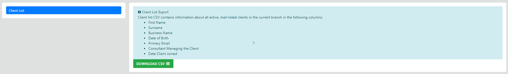 The Mailchimp option allows for exporting client profiles attached to the branch you are signed in to in CSV format
