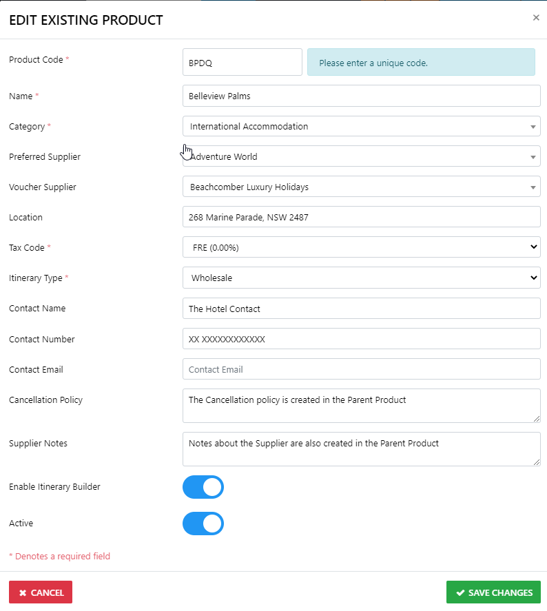 The following form is self explanatory with regard to the information required, however it is essential when creating a Unique Wholesale Product which you need to populate the Itinerary forms that you