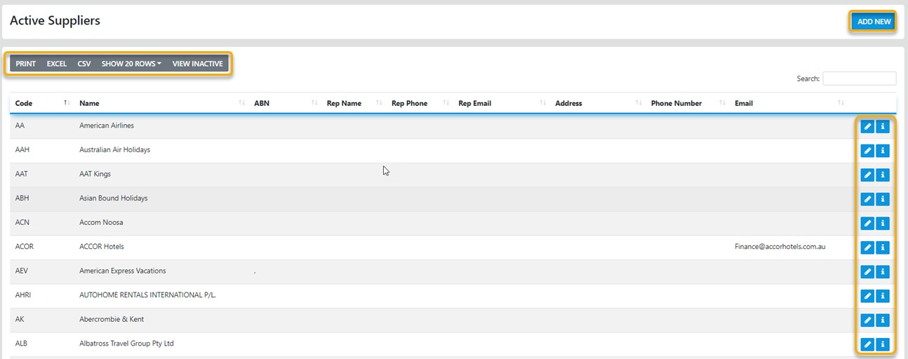 Select Supplier to view the first 20 Suppliers in your database OR select the Search option and enter part of the Supplier Name or Code