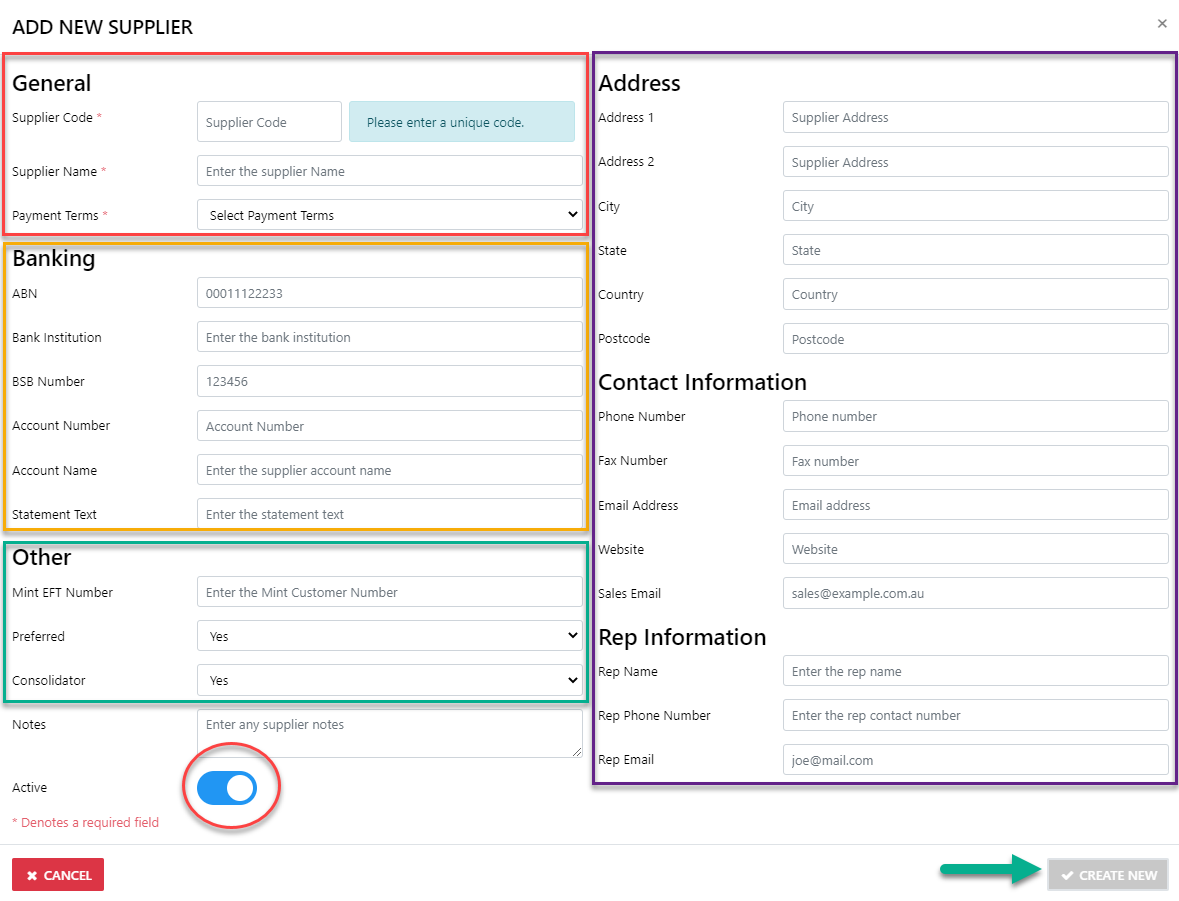 To ADD a New Supplier simply select the ADD NEW option button then fill in all of the required fields
