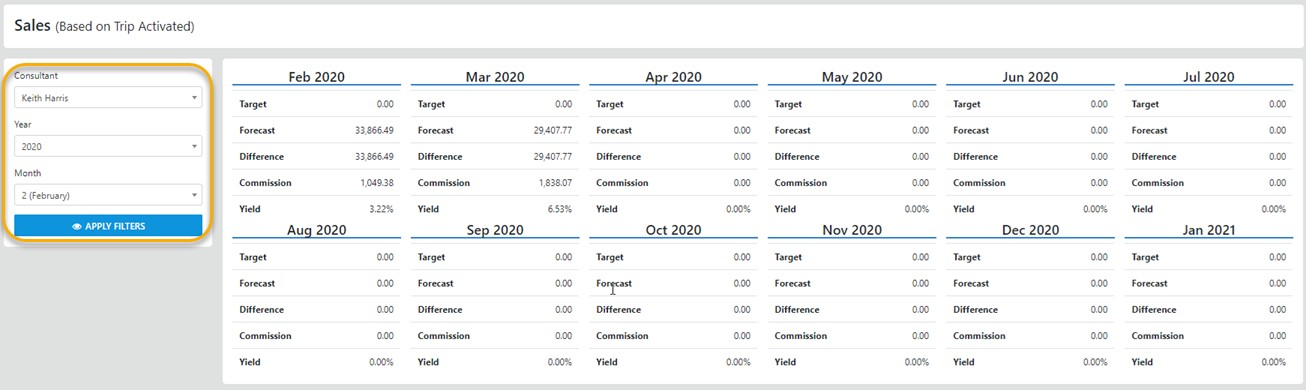 The sideBar Sales option  provides access to Sales and Forecast Income based on the Finalization Date for trips