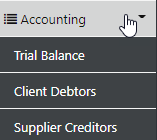 The sideBar  Accounting  Option provides access to the general Trial Balance, Client Debtors and Supplier Creditors