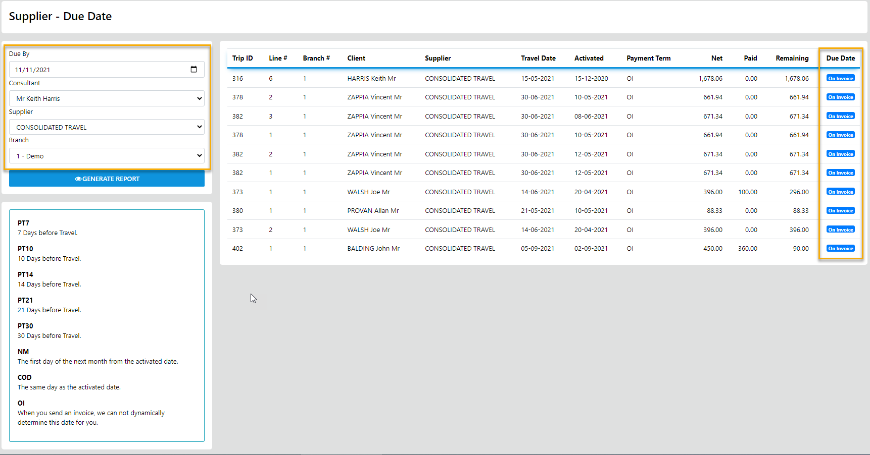 once you select Due Date the following report generates allowing for dateRanging, Consultant, Supplier and branch