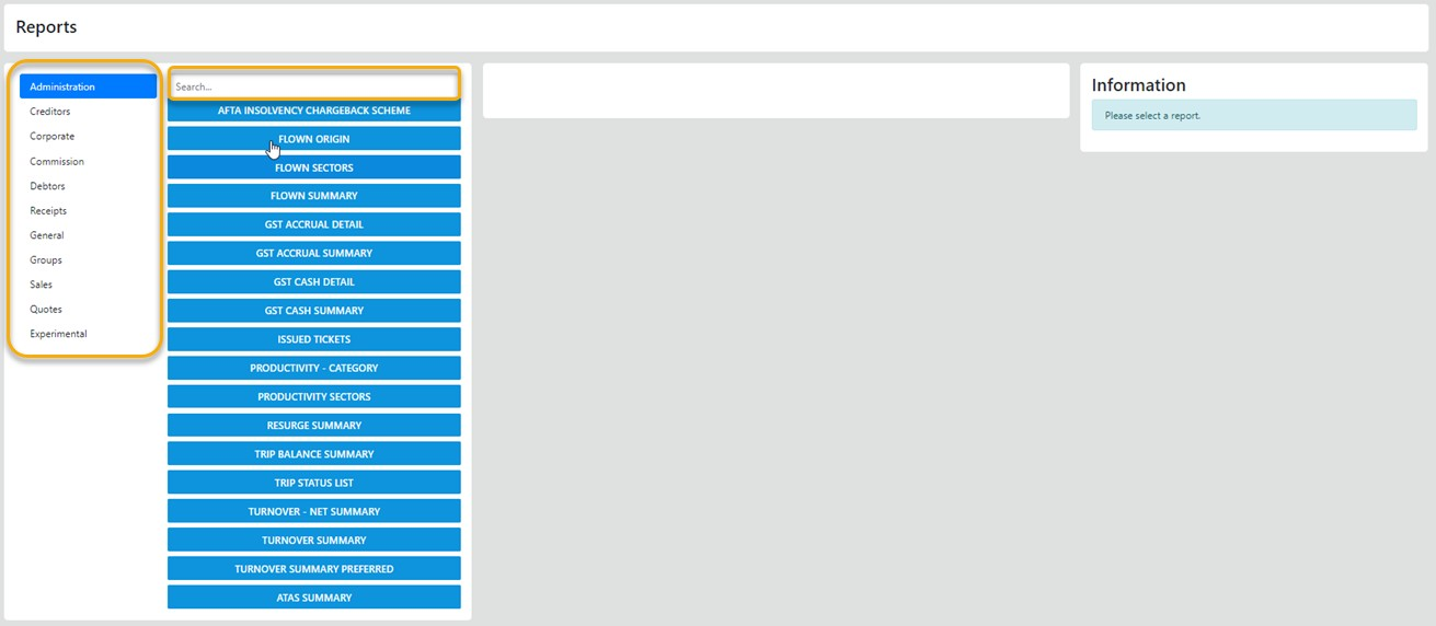 The RED zone are the report modules, the Orange zone lists the reports in the zone and the Search option allows you to search for a specific Report