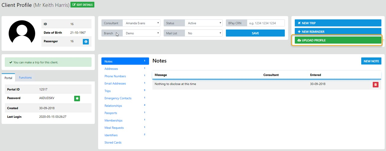 UPLOAD the relevant profile details for a Domestic OR International Trip select the Upload Profile option in the lower left of the Profile and the following data will display