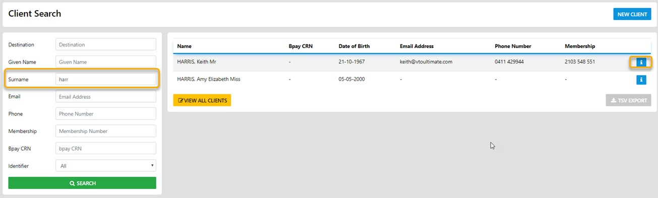 this will reveal the Search option for Client Profiles, Enter part of the Last Name of the client in the "Search" field - and press Enter - this will reveal a list of ALL clients matching the search criteria