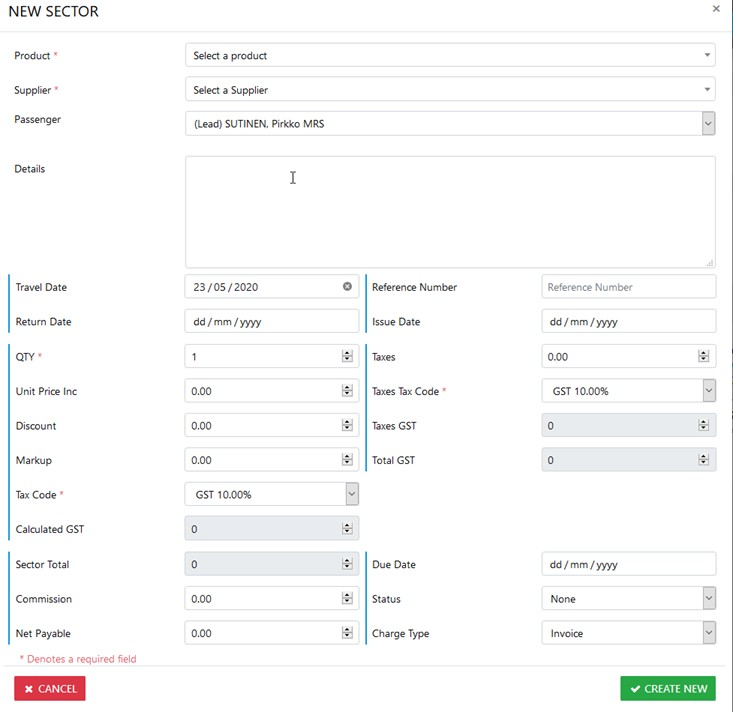 To ADD/Create a NEW trip sector manually, from within the trip select the New Sector option and the details form will display as follows:-