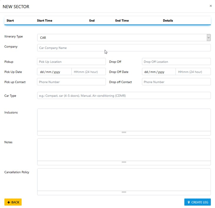 One you've completed the Itinerary information you have the option to Create Leg (meaning create this leg) then select Back to Save the data and return to the New Sector form