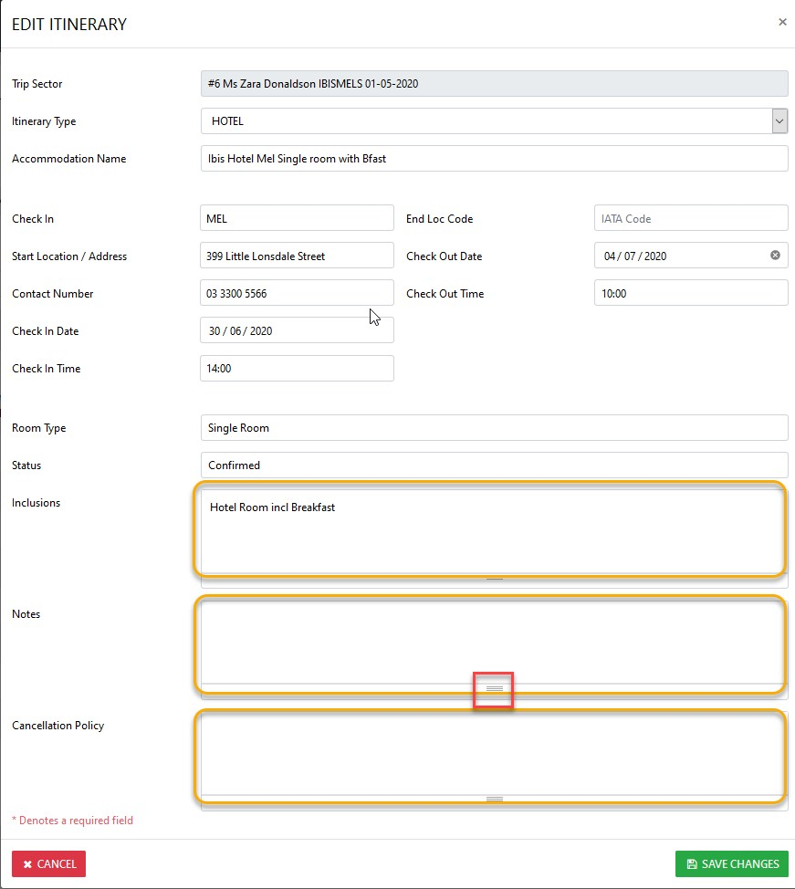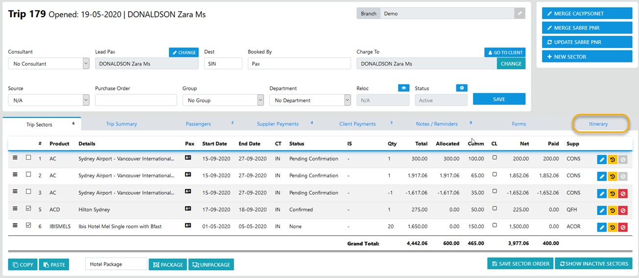 To Edit the details in the Itinerary select the Itinerary TAB