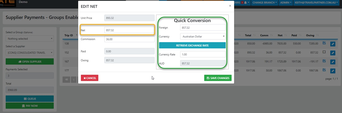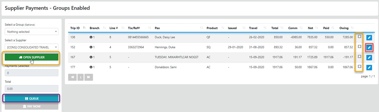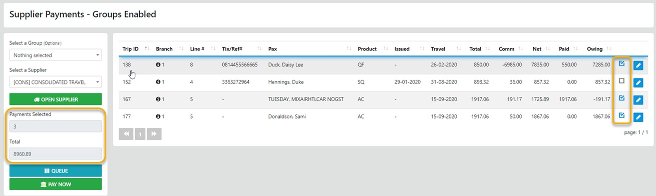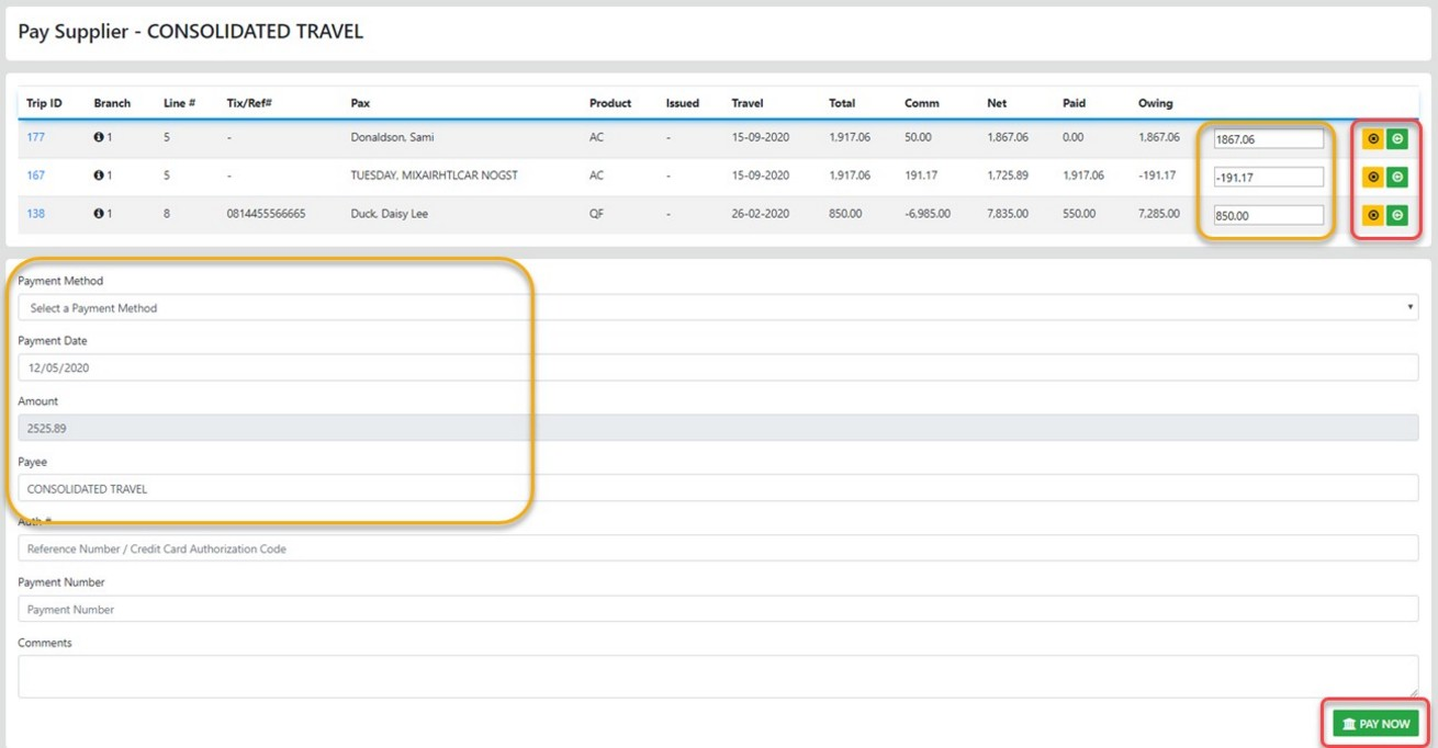 When Paying the Supplier from within a Trip you can only pay line items for the selected supplier in THE Trip