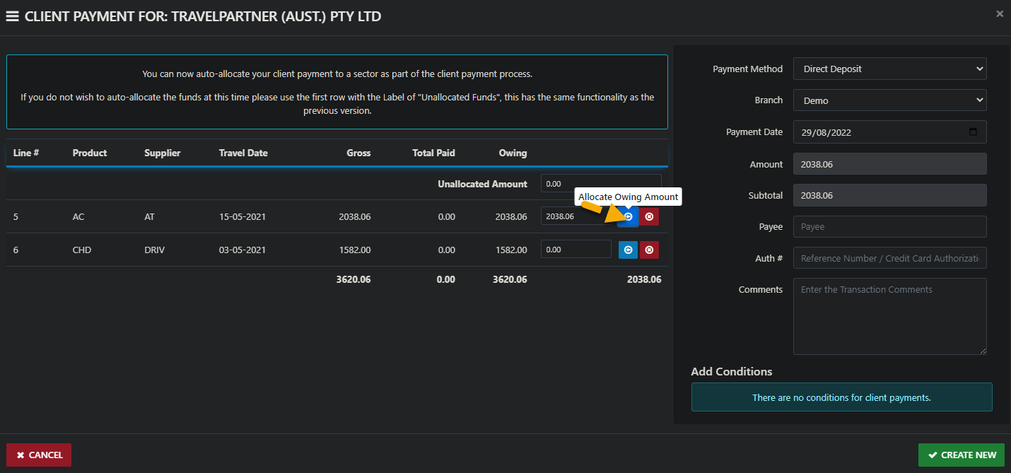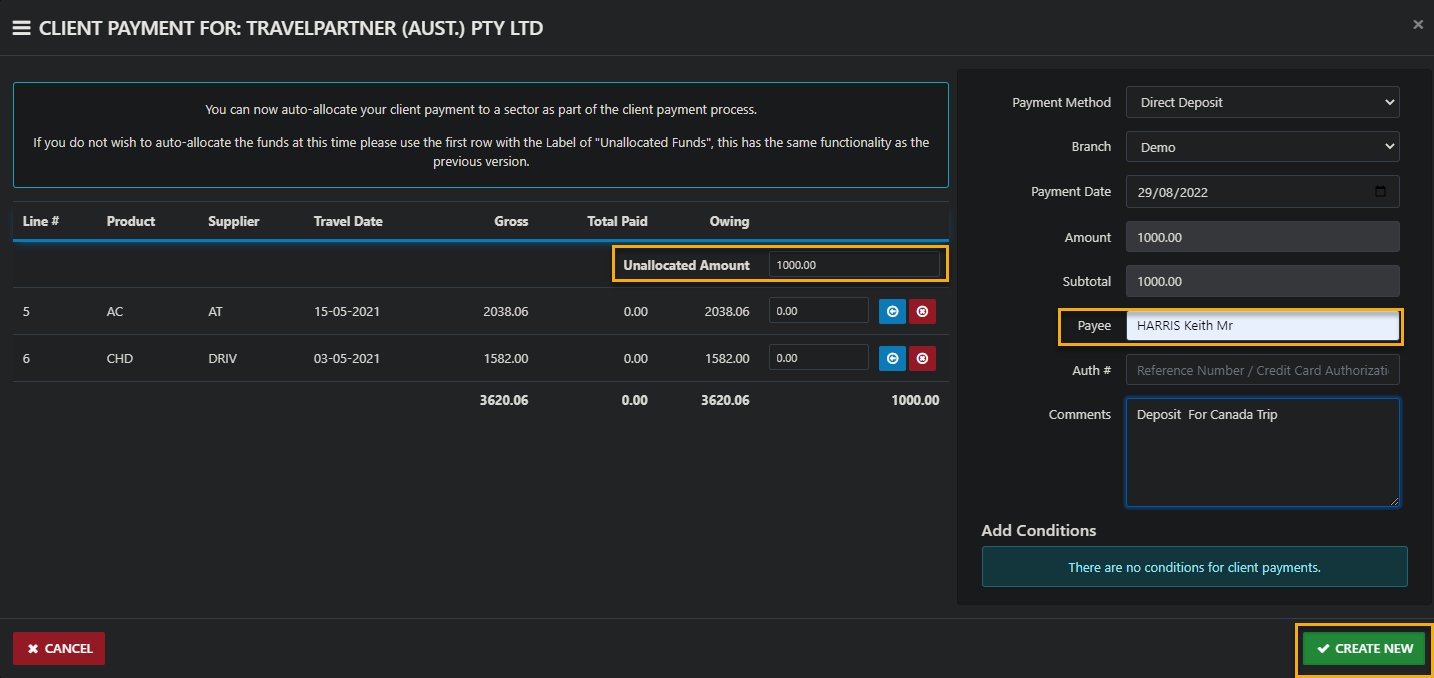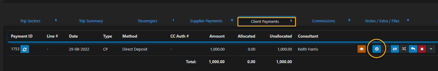 Whilst the amount owing on the trip sectors will display in the form you can enter the actual payment amount for this transaction into the Unallocated Amount Field as in the example.
