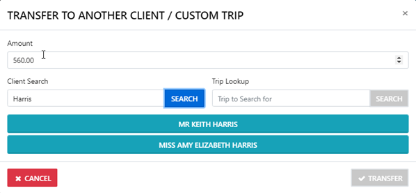 ![]() | Select this button to Transfer funds from one Client trip to another trip for the Client (this has the same effect as allocating to another trip for the client) |