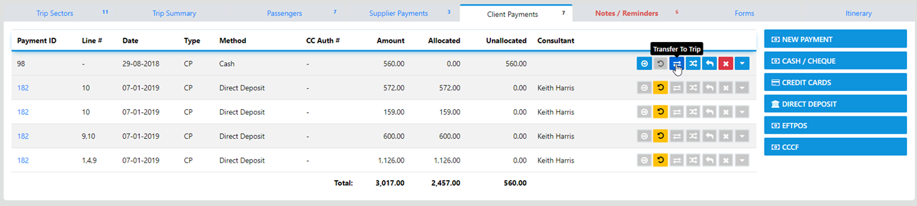 ![]() | To transfer funds from Client A's trip to Client B you use the this button. |