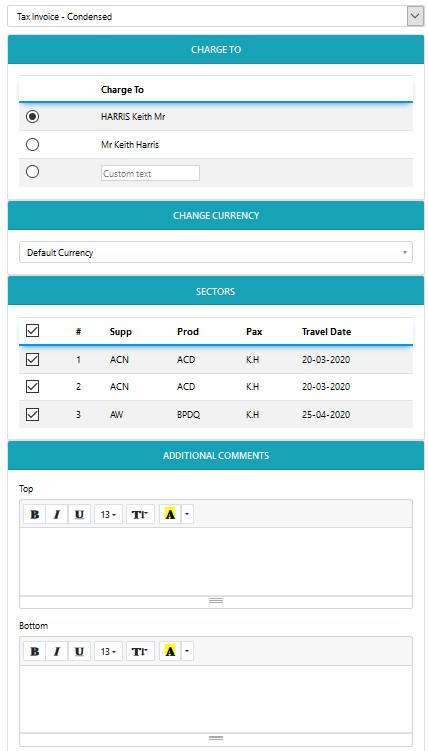 NOTE: ALL invoices allow for selection of the following:-