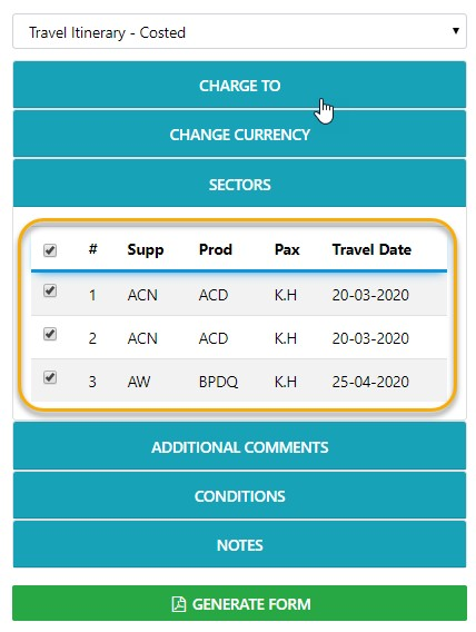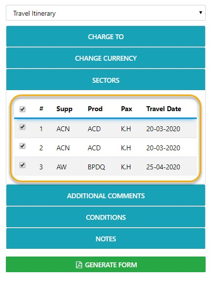 Select FORMS - Travel or Costed Travel Itinerary - Select as many Conditions as required on the form - Add a free form Comment in the fields provided