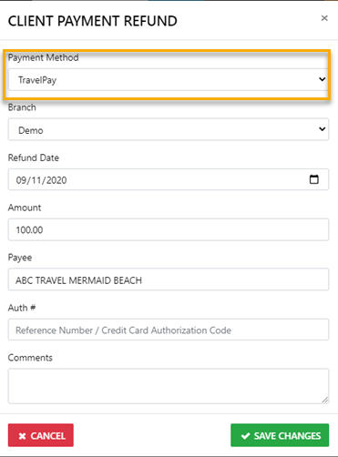 The refund widow will display allowing you to select either TravelPay (which will process via the Gateway (this is the recommended option) or you can choose to use an alternate refund method from the list box