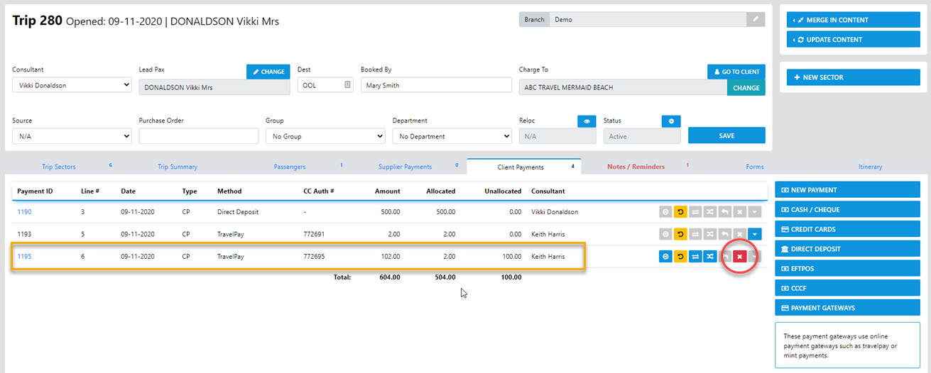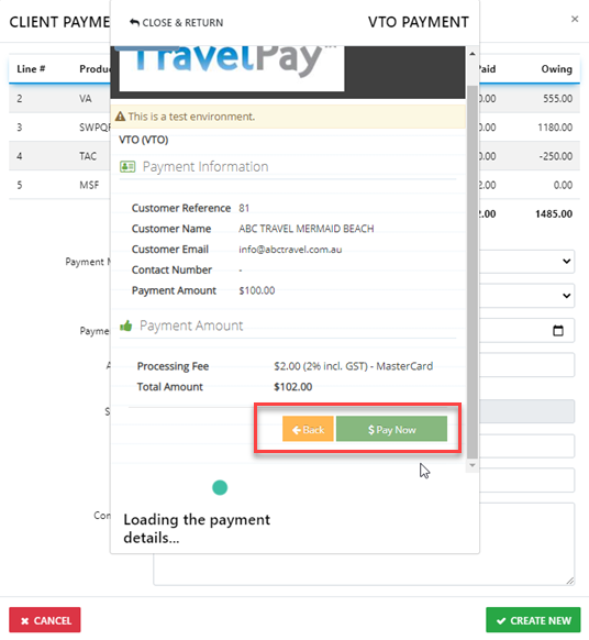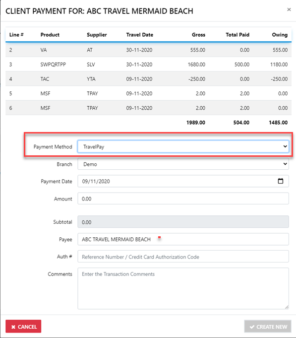 “TravelPay Payment Gateway” – This method can be used to receipt payments from the client in the trip which is a Live payment using the Client credit card details