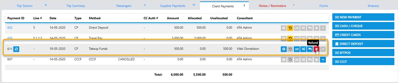 ![]() | Select this Icon in the sector to process a refund to a client. |