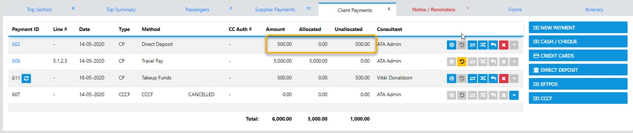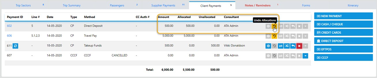 In this case you would need to Undo the allocation first – to do this you go to Trip - “Trip Details – Client Payments” view,