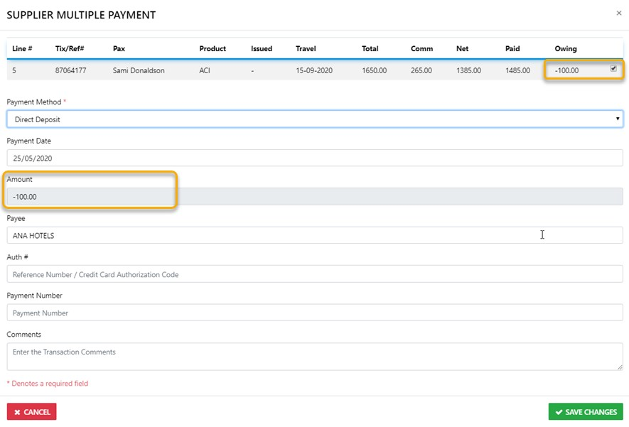 process the receipt of funds from a Supplier in the Trip by selecting the Multiple Payments option to receipt the full amount