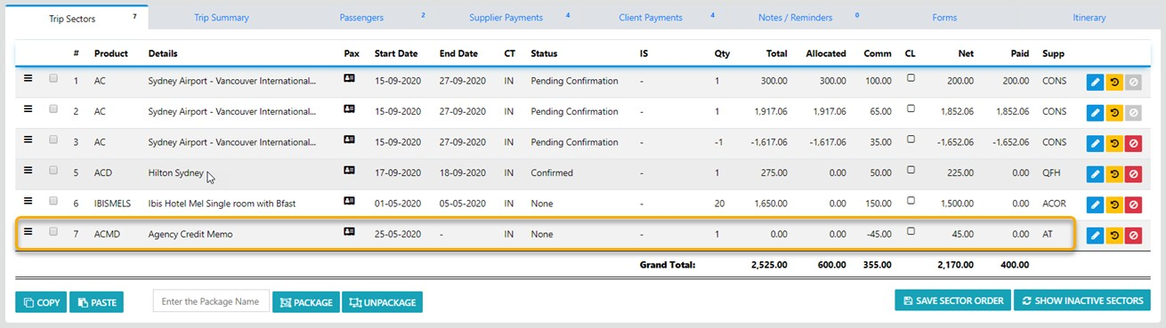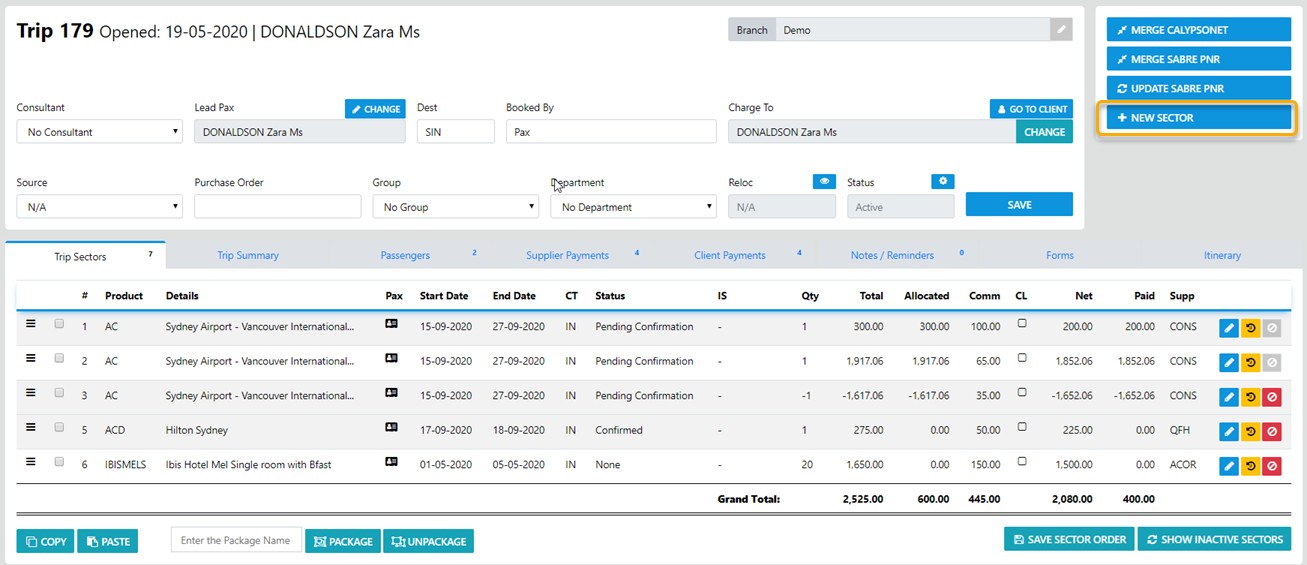 First select the Trip which needs to have the ADM added then select the "New Sector" button