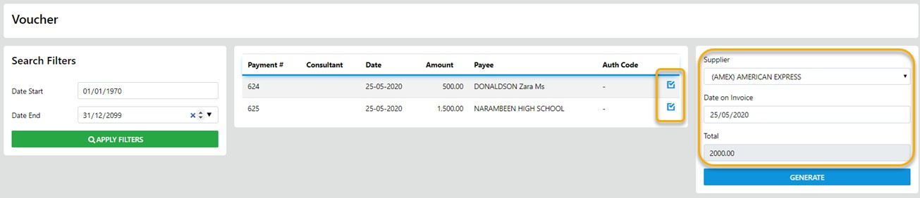 Select the line items you need to raise an Invoice for then Select the appropriate Supplier of the Voucher etc, the Total will auto calculate so all that is left to do is select the Generate button