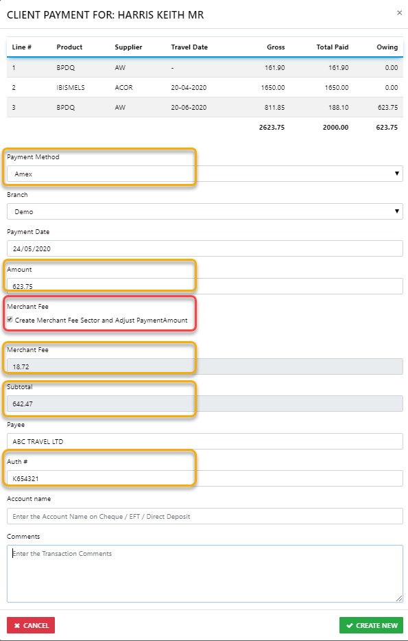 - Using the Payment Gateway automatically creates a Merchant Service Fee sector with the supplier with the Supplier being the Card you selected e.g. AMEX, VISA etc.