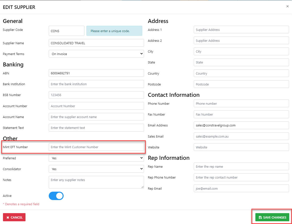 From here you just UPDATE the MCN number field with the Correct Mint EFT Number and Save the Changes