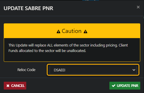 to UPDATE the existing PNR select Update (your GDS) PNR and the following will display